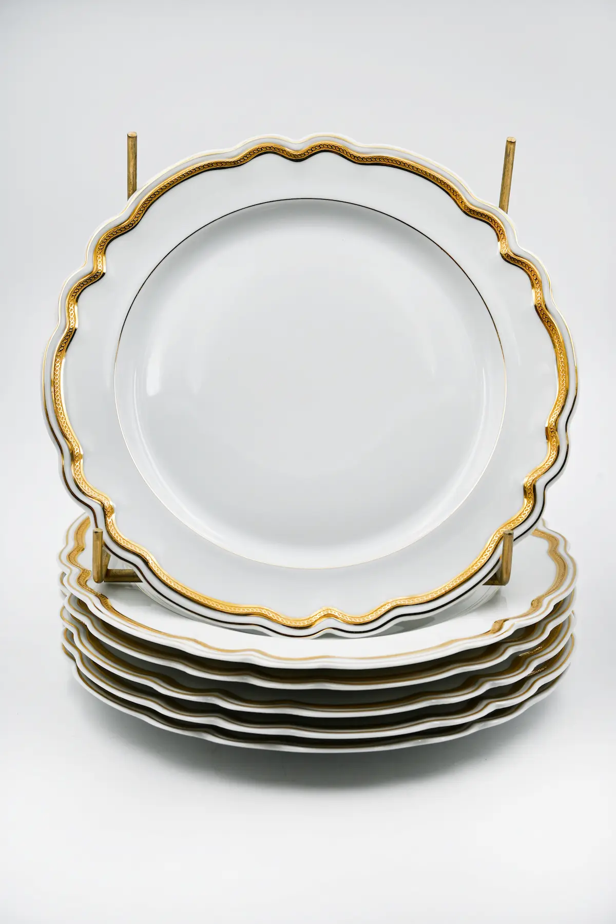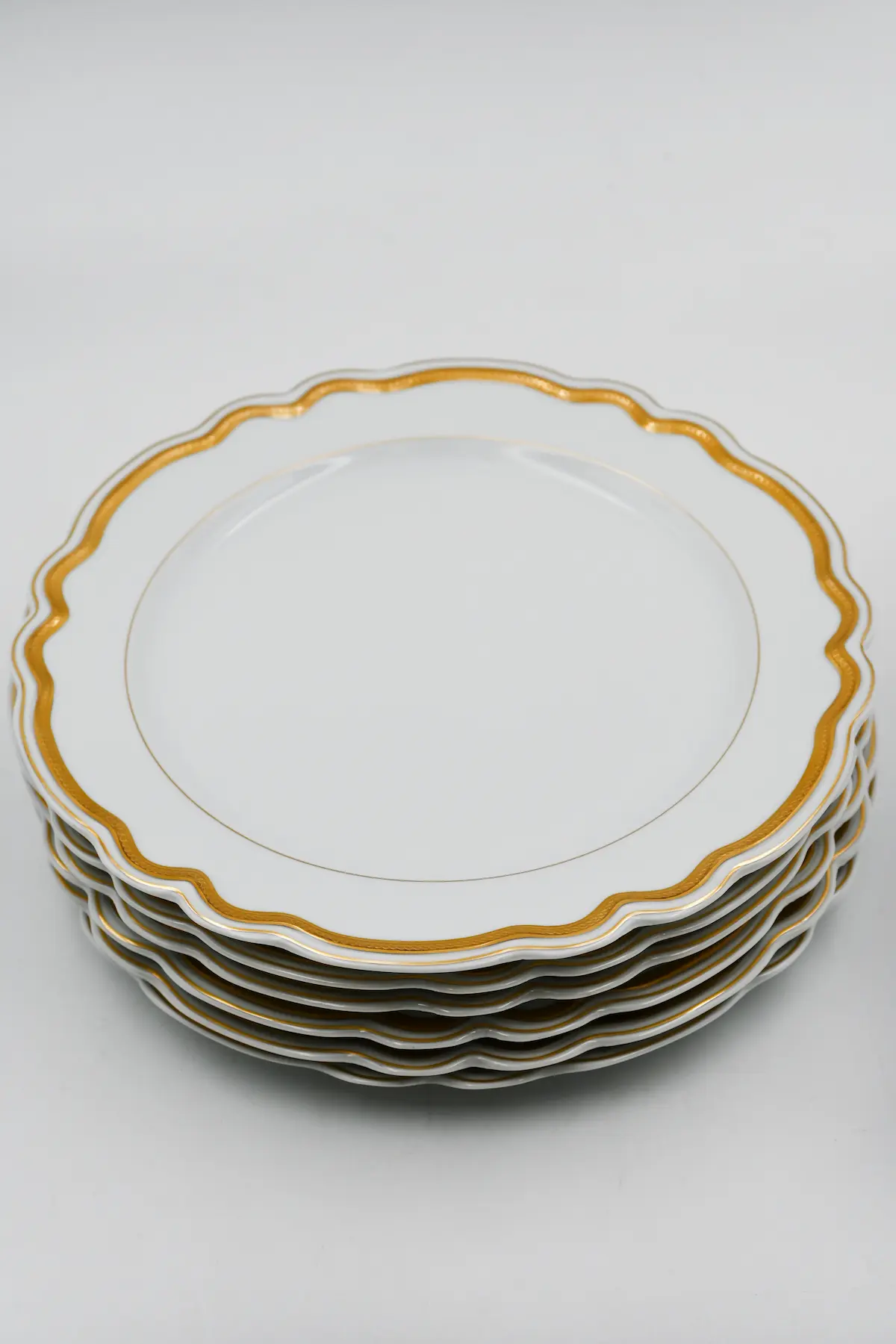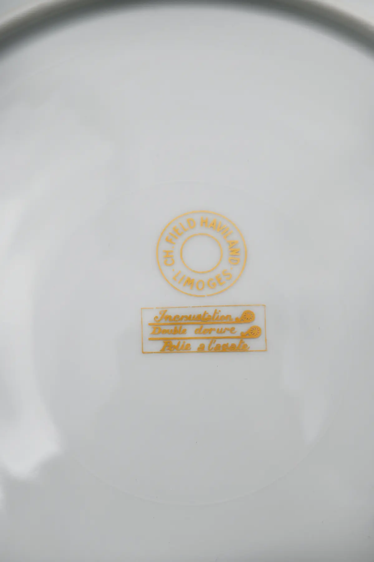 Ce service assiette réunit dix-huit assiettes en porcelaine de Limoges au style raffiné. Les assiettes présentent un bord ondulé très original. Chaque assiette possède un liséré or en double dorure polie à l’agate. Les assiettes blanches et dorées portent toutes la signature CH Field Haviland Limoges. Ce service crée une table élégante et met facilement en valeur chaque plat.