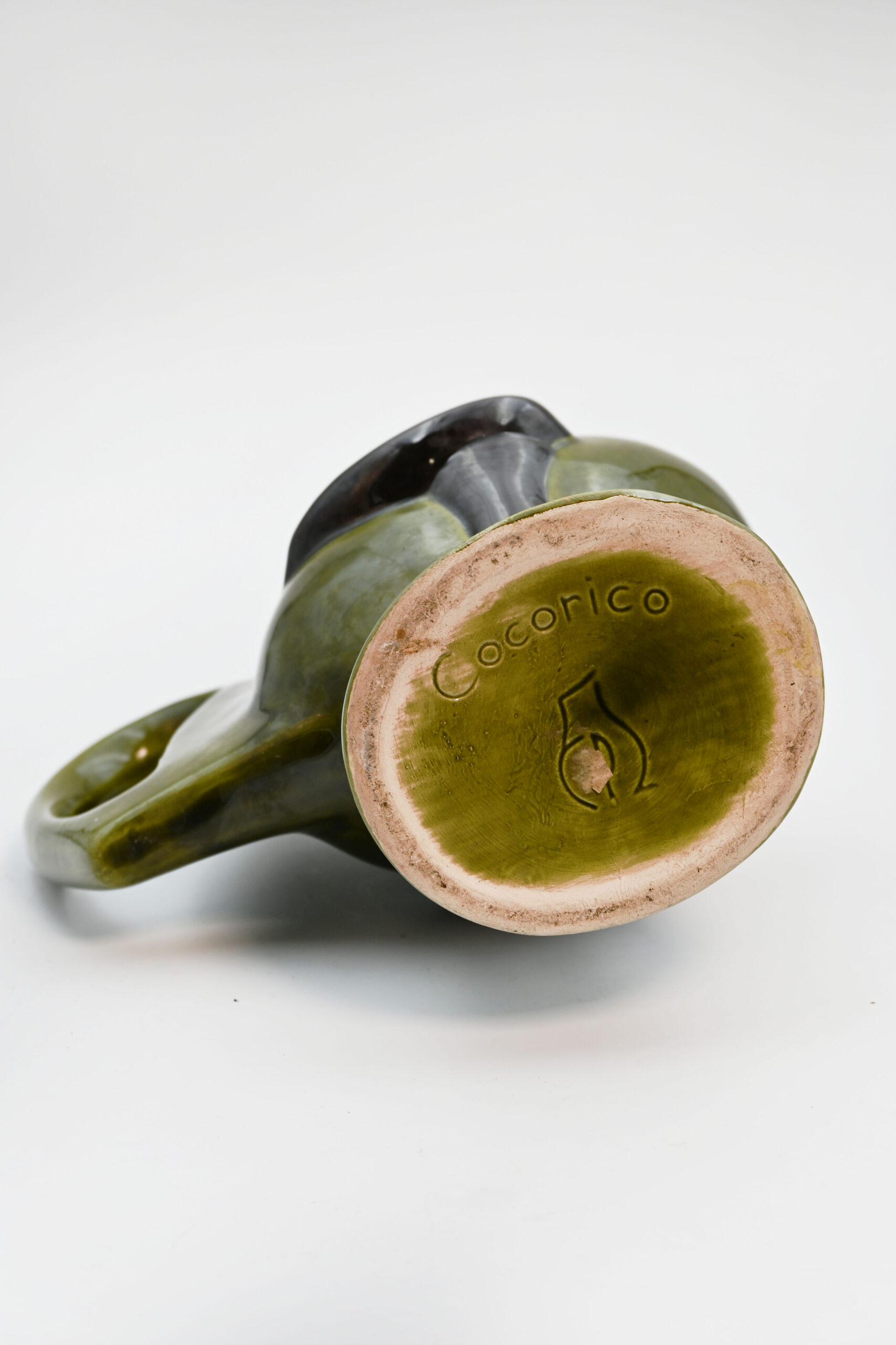 Cette carafe en céramique en forme de coq allie design vintage et praticité. Son bec sert de bec verseur, facilitant le service. Sa large poignée assure une prise en main confortable. Cette pièce, intitulée “Cocorico” et signée Poet-Laval sur le dessous.