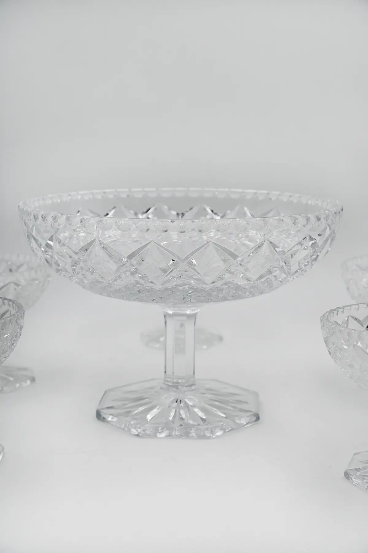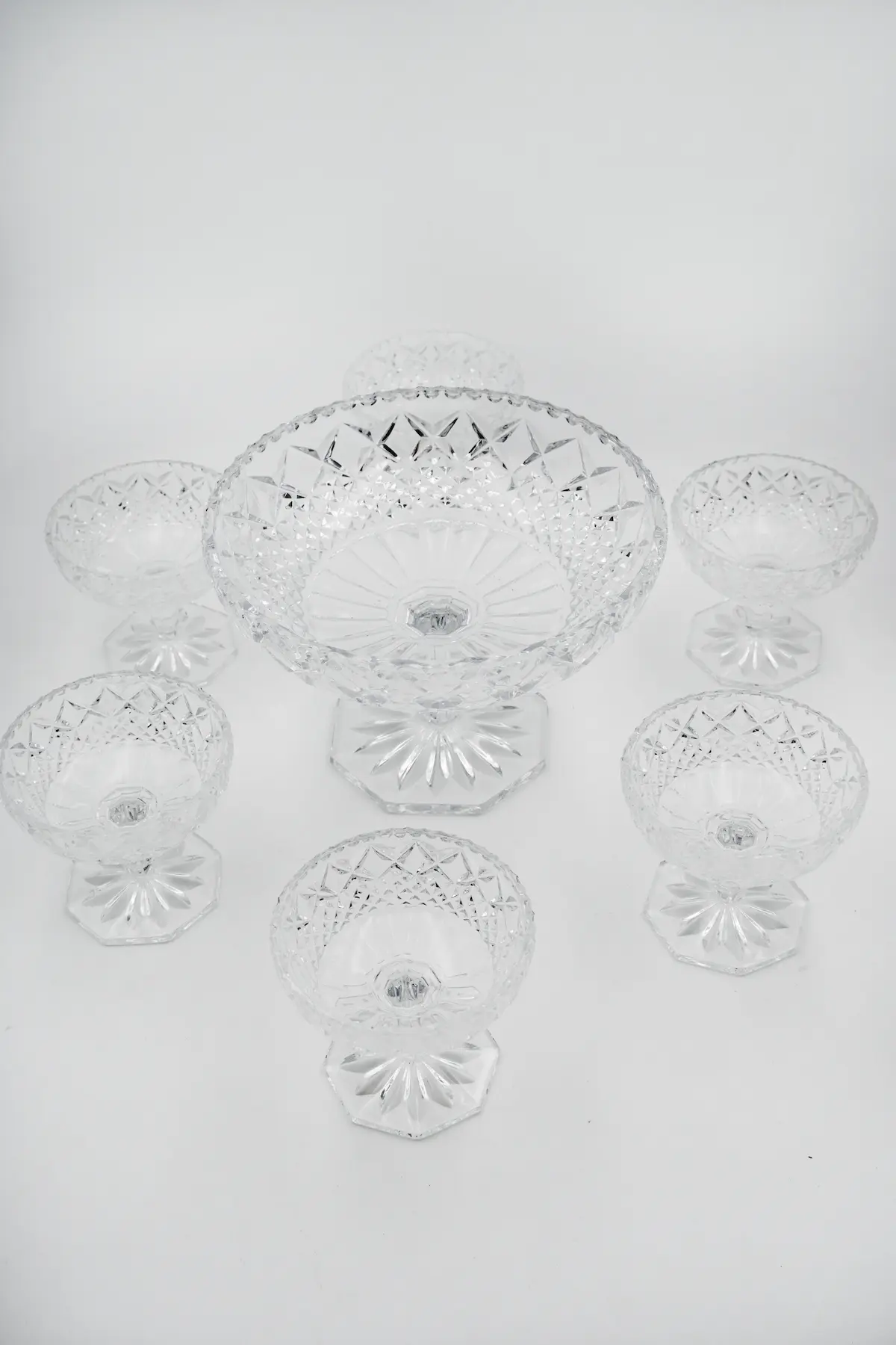Ces coupes à dessert en cristal forment un service élégant pour vos glaces, fruits frais et autres desserts. Le service réunit une grande coupe de présentation sur pied et huit petites coupes assorties. Chaque pièce présente un décor taillé géométrique et un pied hexagonal. Ce service donne du relief à la table et crée un effet lumineux très agréable.