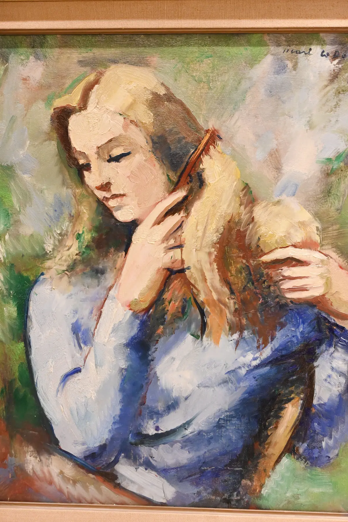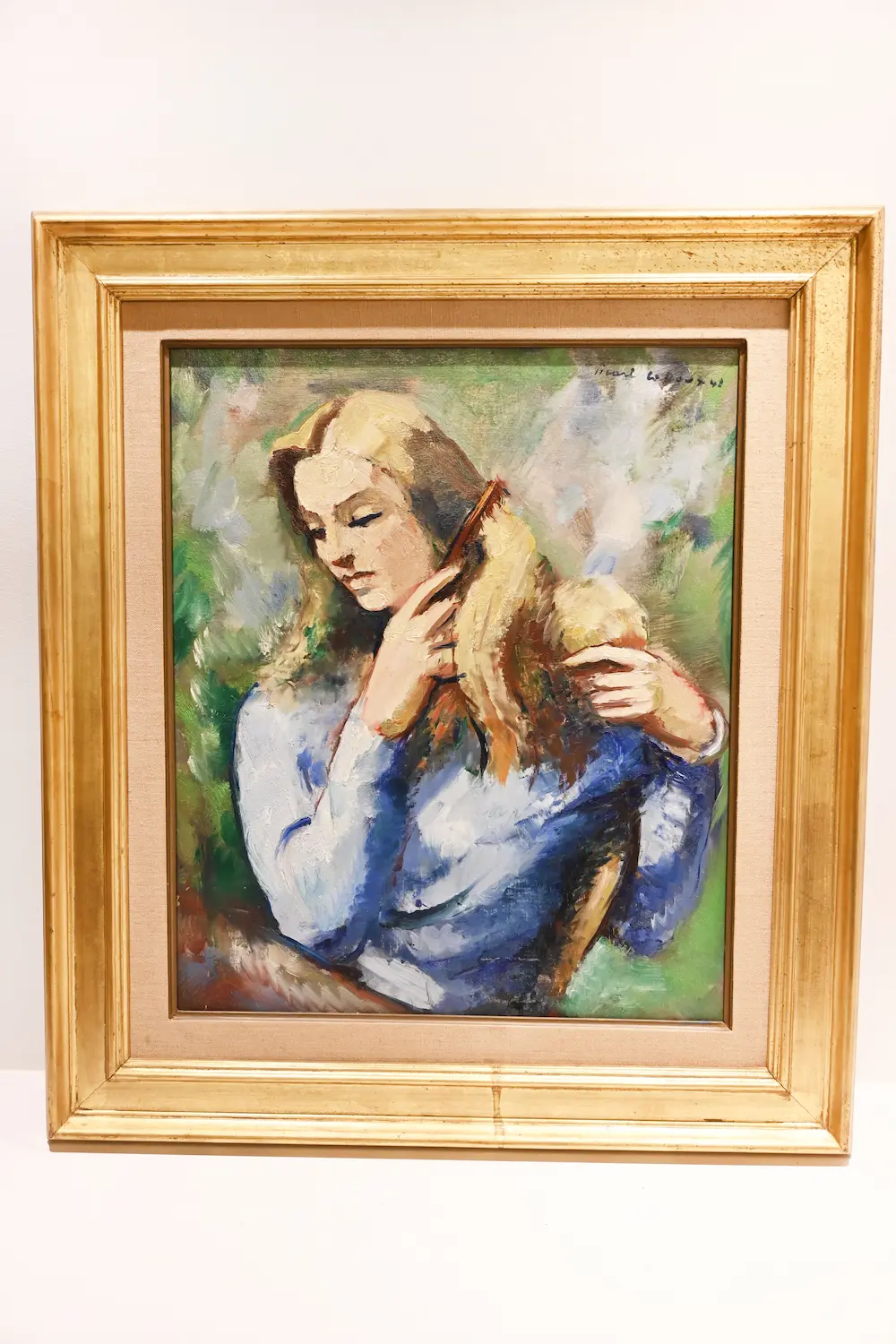 Ce tableau représente une femme assise en extérieur, vêtue d’un pull bleu. Elle tient un peigne dans une main et ses cheveux blonds dans l’autre. L’artiste saisit un instant simple, transformé par la peinture en une scène de tendresse et de féminité. La lumière adoucit les contours et renforce l’émotion du geste.