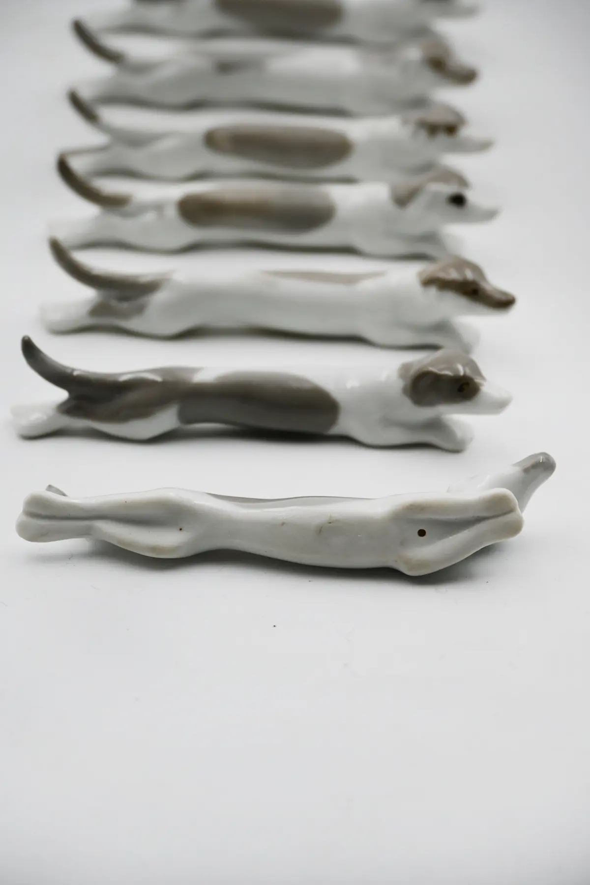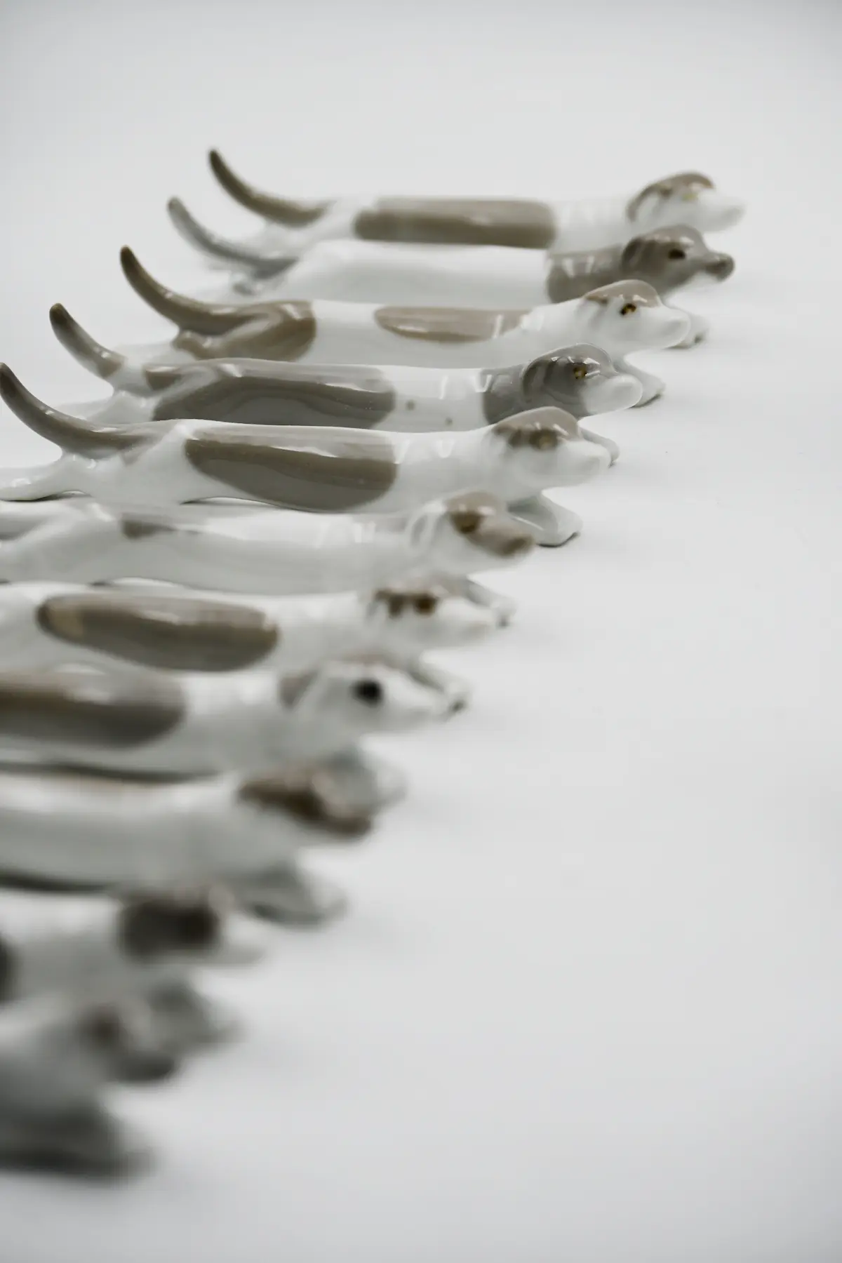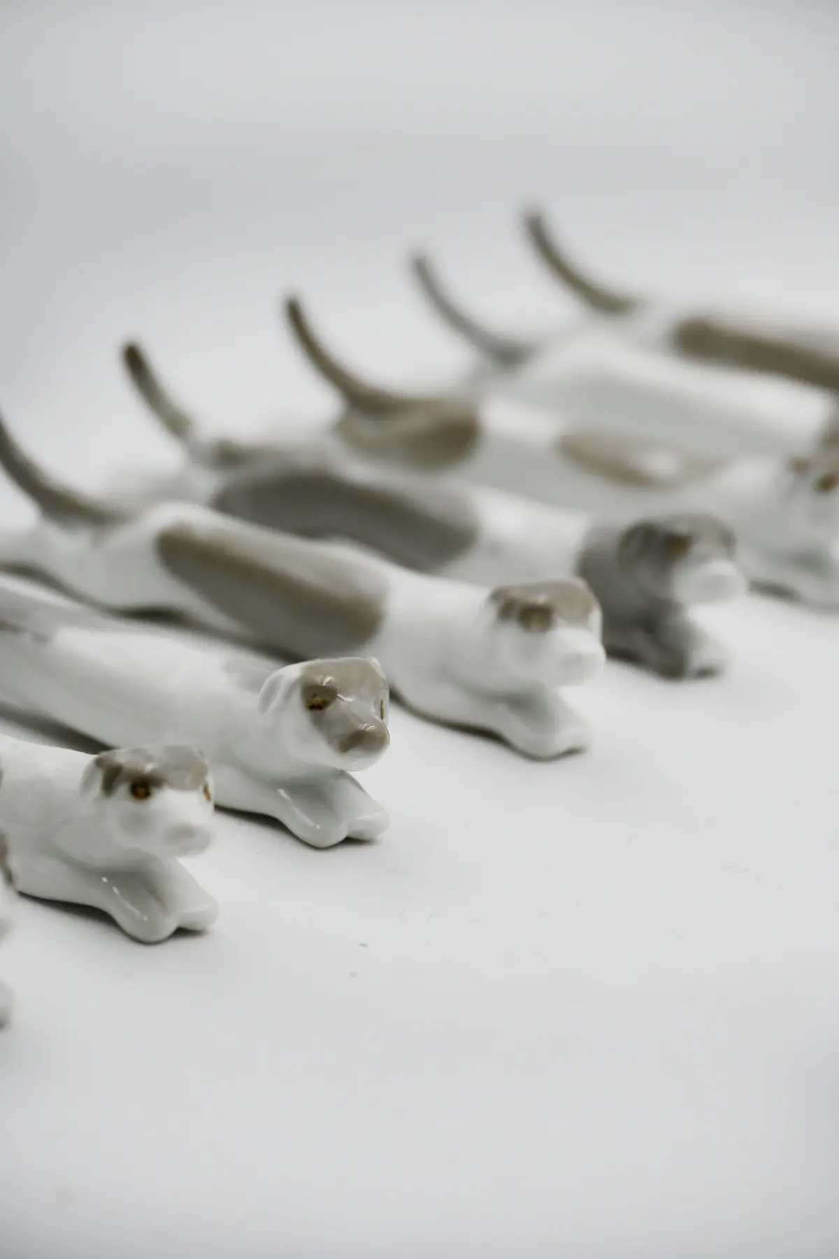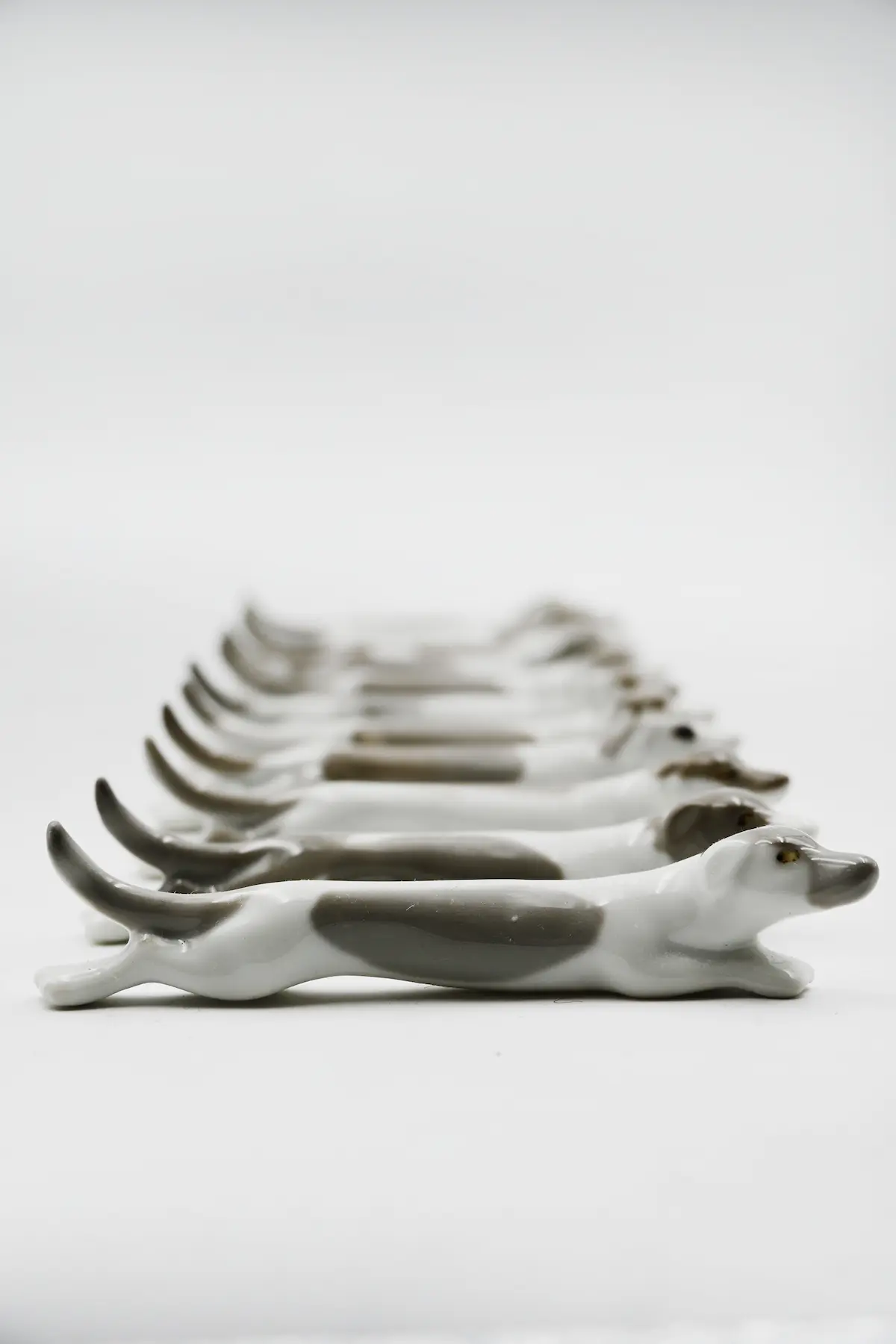Ce lot rassemble onze porte couteau chiens en céramique, chacun en forme de petit chien blanc tacheté gris. Les chiens reposent en position allongée avec les pattes tendues. Les artisans peignent les yeux à la main, ce qui crée de légères variations charmantes. Ces porte couteau ajoutent une touche tendre et originale à l’art de la table. Leur style doux et ludique crée une ambiance chaleureuse lors des repas.