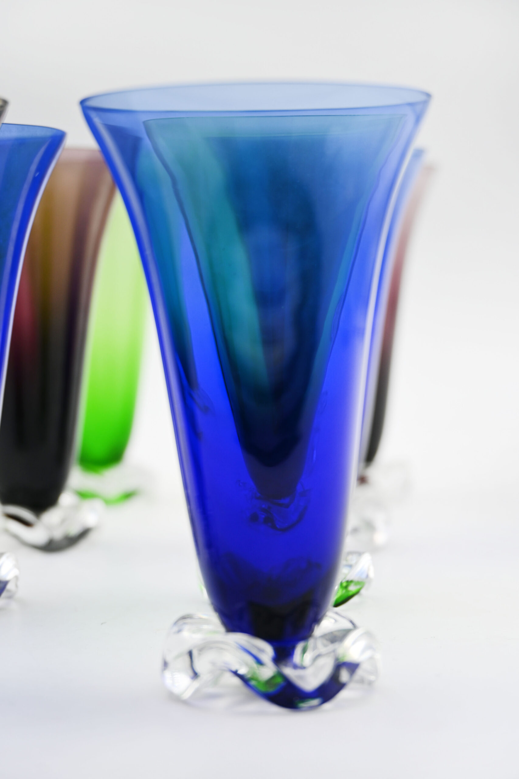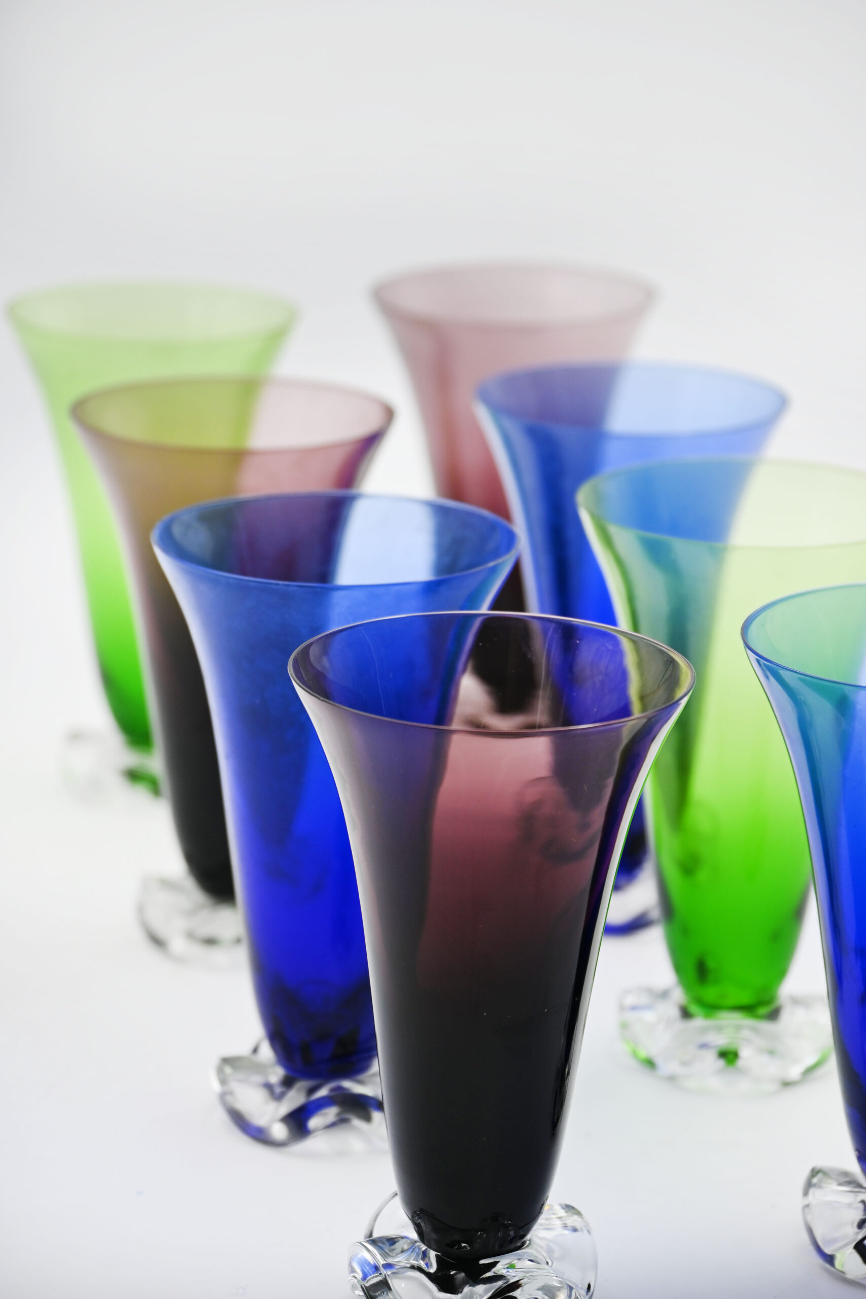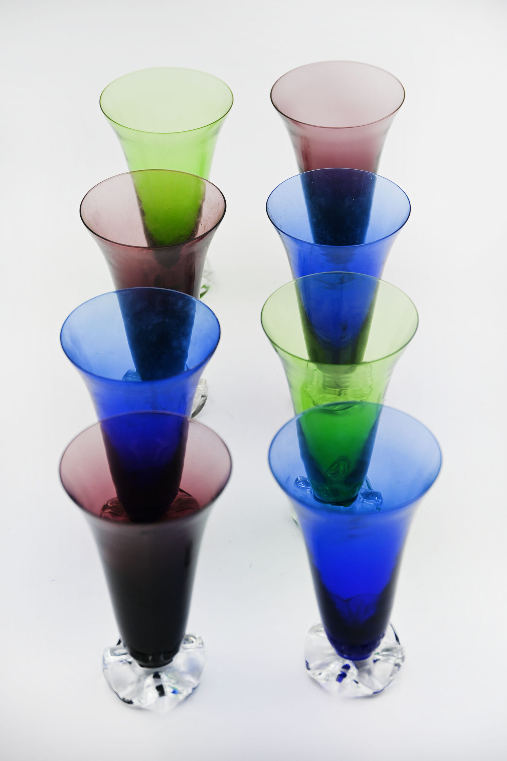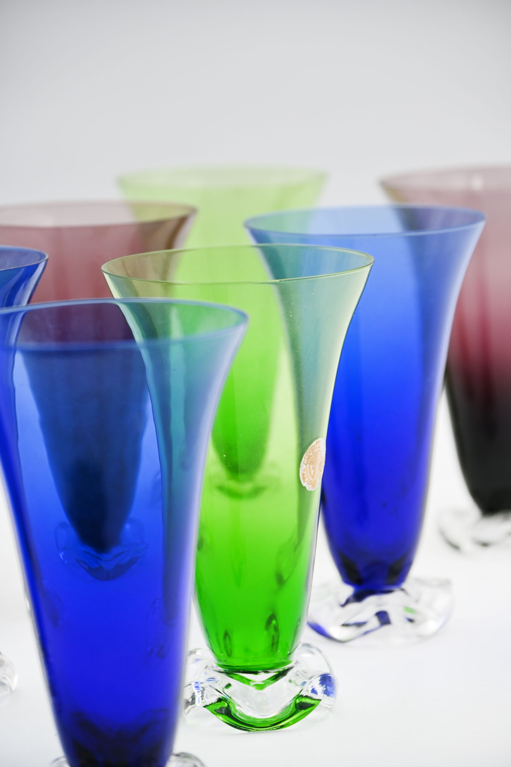 Ces verres à champagne en cristal Portieux affichent un pied ondulé élégant. Le set comprend trois verres bleus, trois rose aubergine et deux verts. Chaque coupe de champagne mesure 13 cm de hauteur. Ces verres en cristal offrent un design moderne tout en restant pratiques pour servir vos boissons. Ils illuminent la table grâce à leurs couleurs vives et leur transparence cristalline.